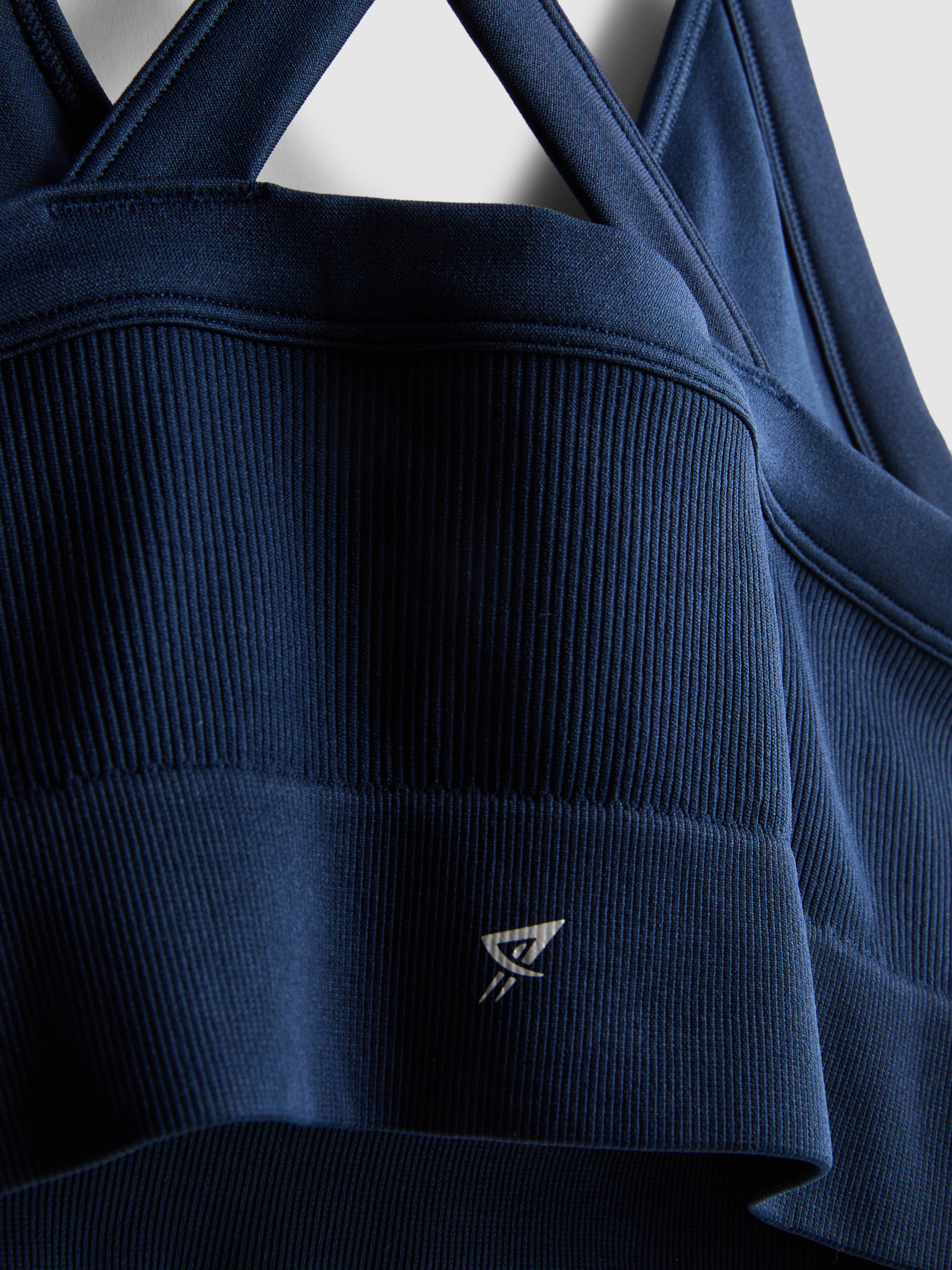 Move with ease in this navy seamless performance crop, designed to support you through workouts or wind-downs. Made in a stretchy, ribbed knit fabric, it hugs the body for a snug, comfy fit. The scoop neckline and wide shoulder straps offer coverage and support, while the criss-cross back adds a stylish twist and extra hold. Pair it with the matching shorts and your favourite gym trainers for a performance wear fit you’ll be wearing on repeat.