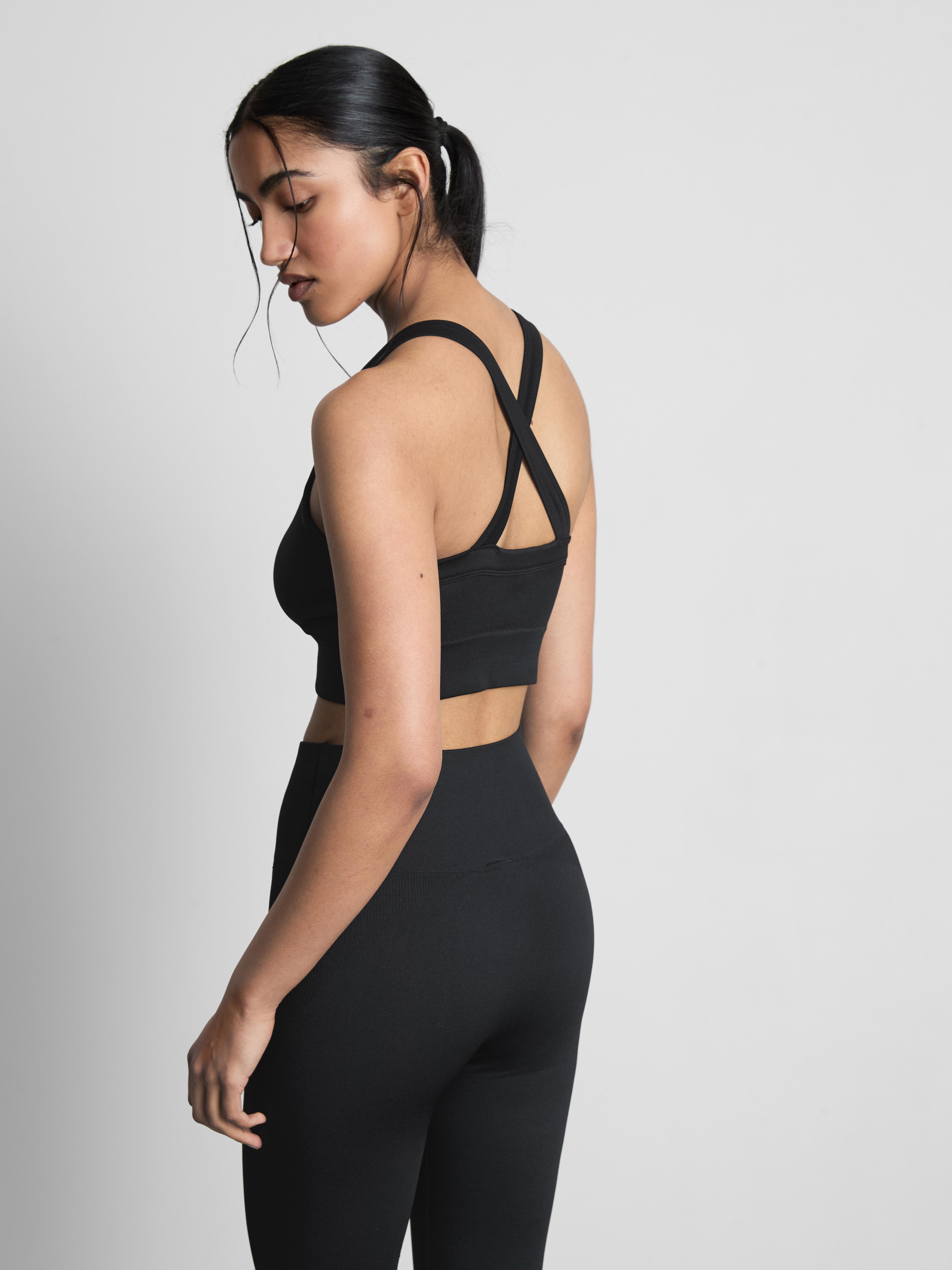 Train in style with this seamless performance crop top in a classic black shade. Designed with a fitted silhouette and scoop neckline, it offers a supportive, comfortable fit for your workouts. The cropped length sits above the waist, while the wide hem band adds extra support. Strappy criss-cross detailing at the back gives a sporty, stylish finish. Made from a stretchy, seamless fabric, it provides freedom of movement and a smooth, flattering shape. Perfect for gym sessions, yoga or casual athleisure looks, this crop top combines performance and style in one easy-to-wear piece.