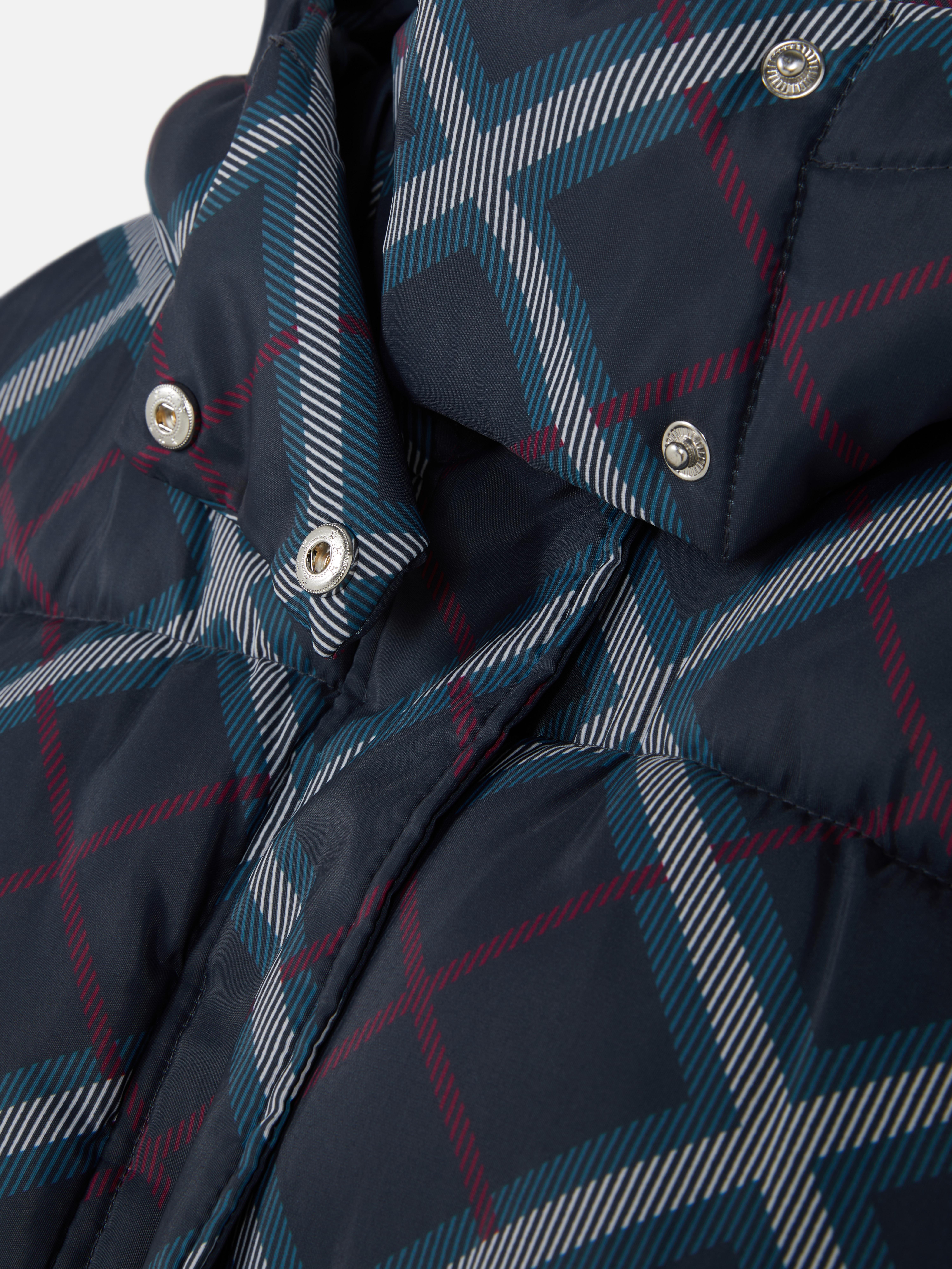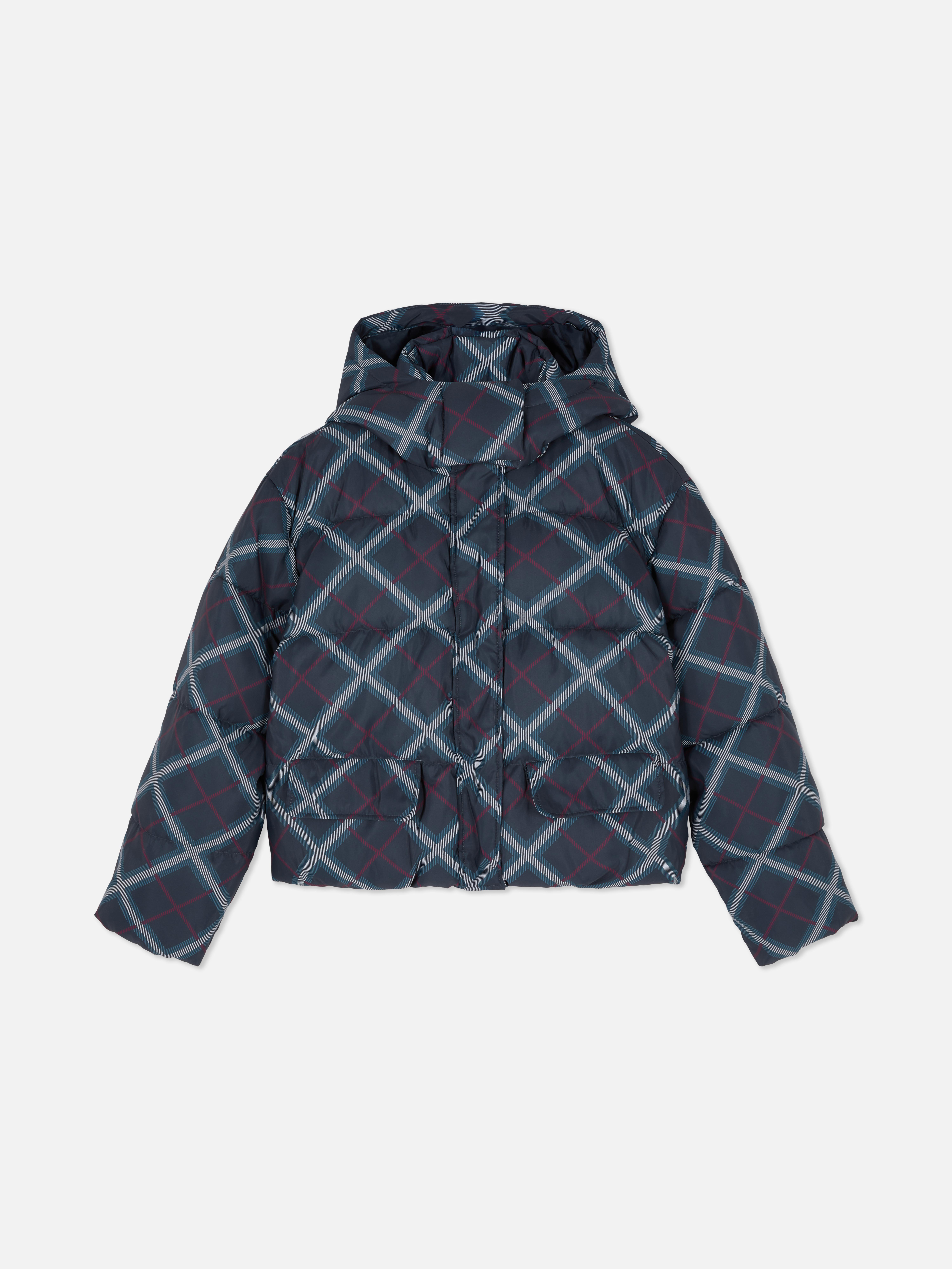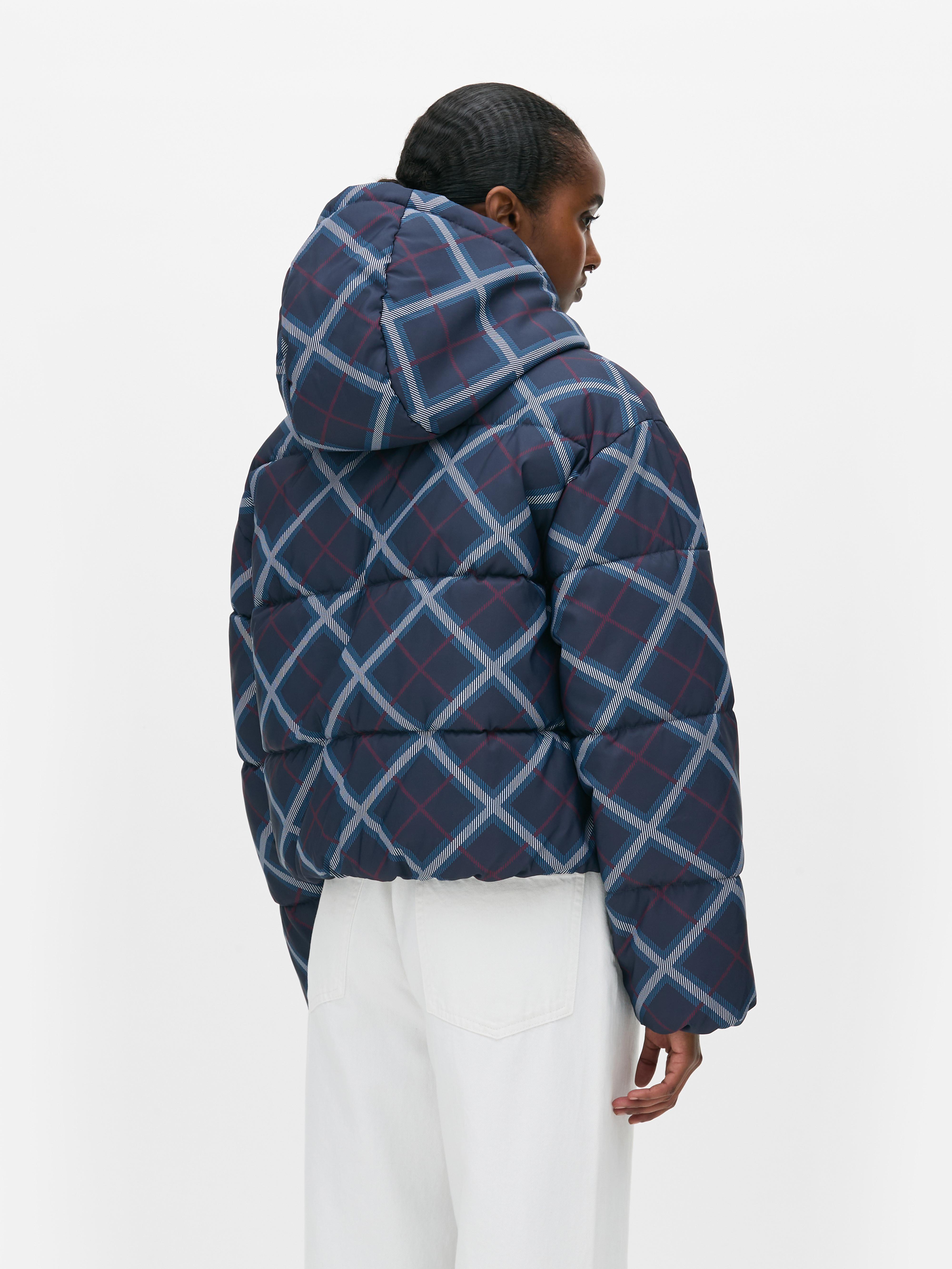 This puffer jacket comes in an all-over check print with a hood and a full-length zip