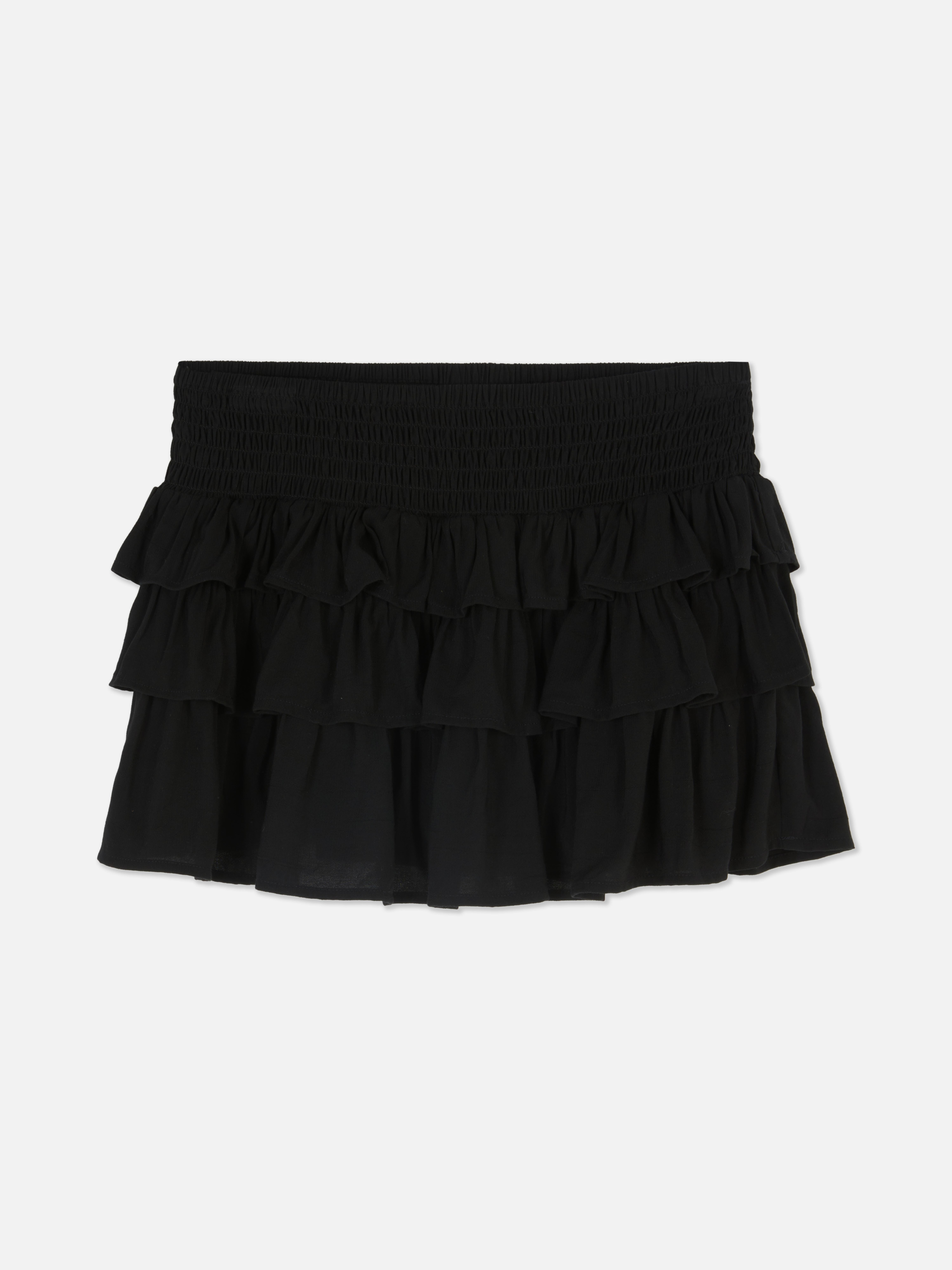 Swish and twirl in this black rara mini skirt that's ready for any seasonal outing. Three tiers of bouncy ruffles add movement and charm, while the shirred waistband stretches to fit your silhouette just right. This skirt is the answer to those tricky transitional weather days when you want to feel breezy but put-together. Team it with a white top and ballet flats for coffee catch-ups, or dress it up with heeled sandals and a silky cami for evening plans.