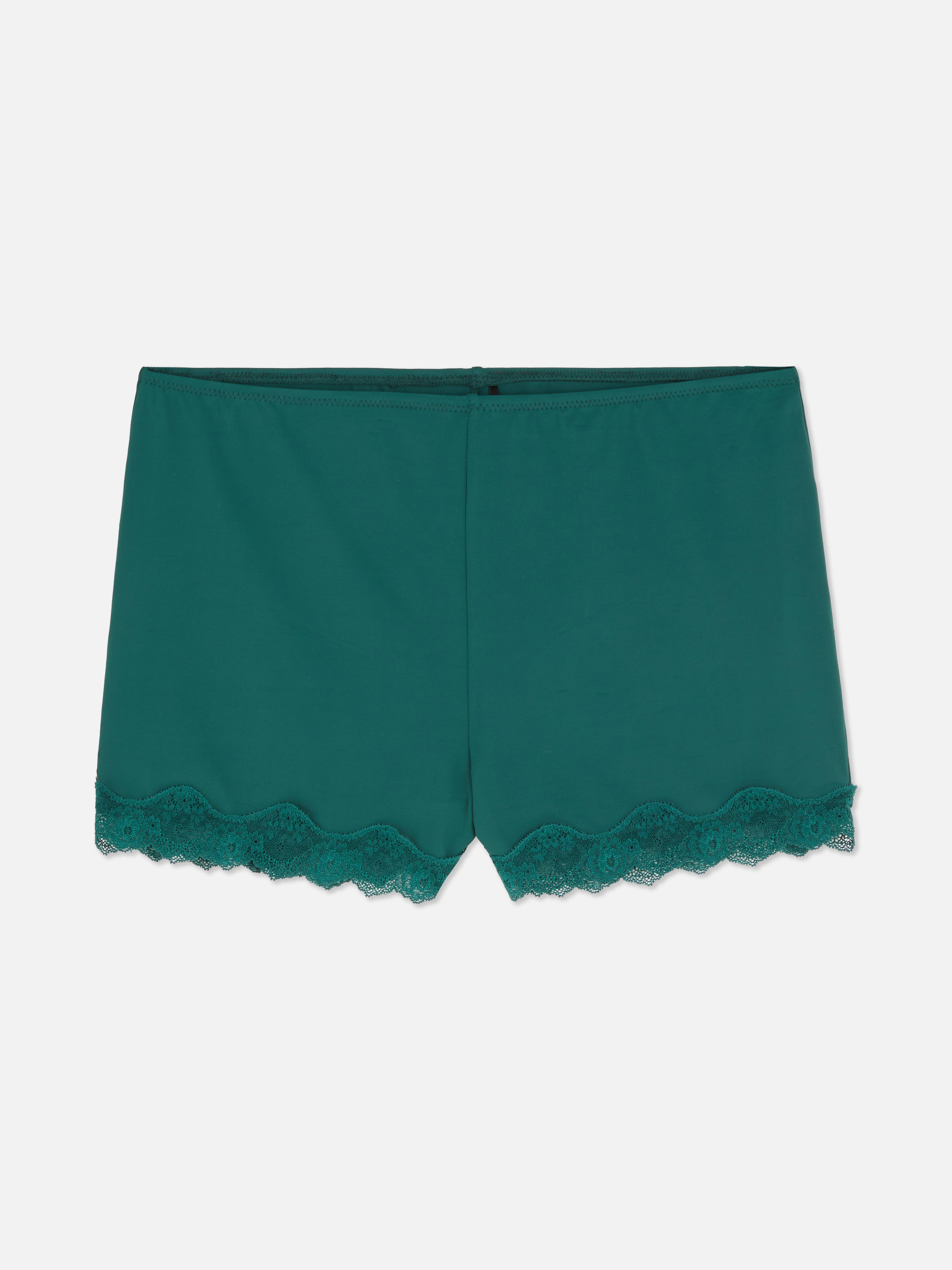 In a soft, slinky fabric, these shorts come with an elasticated waist and are finished with a lace trim