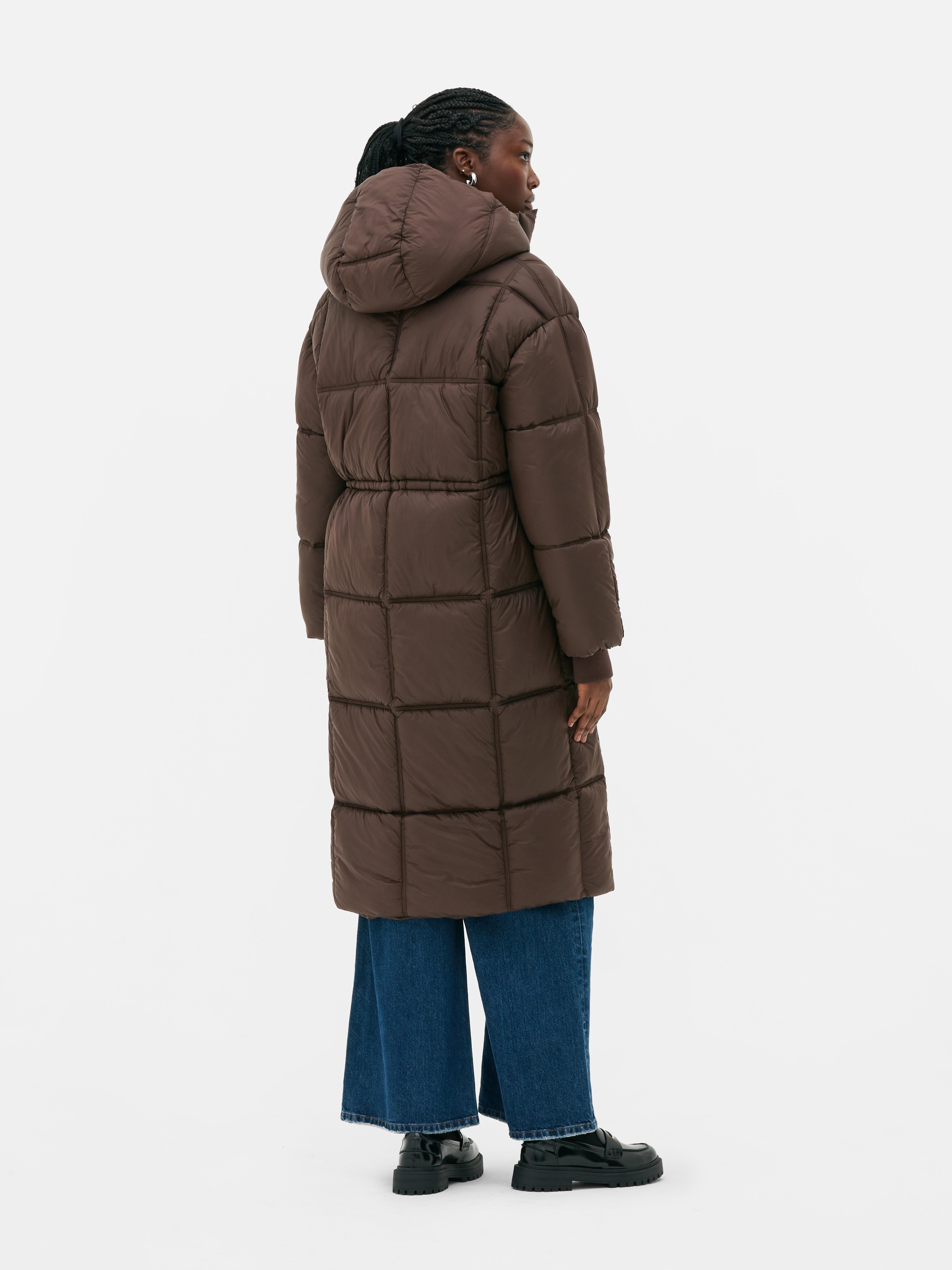 With a square padding design, this longline jacket has a cinched waist feature, an attached hood and two side pockets