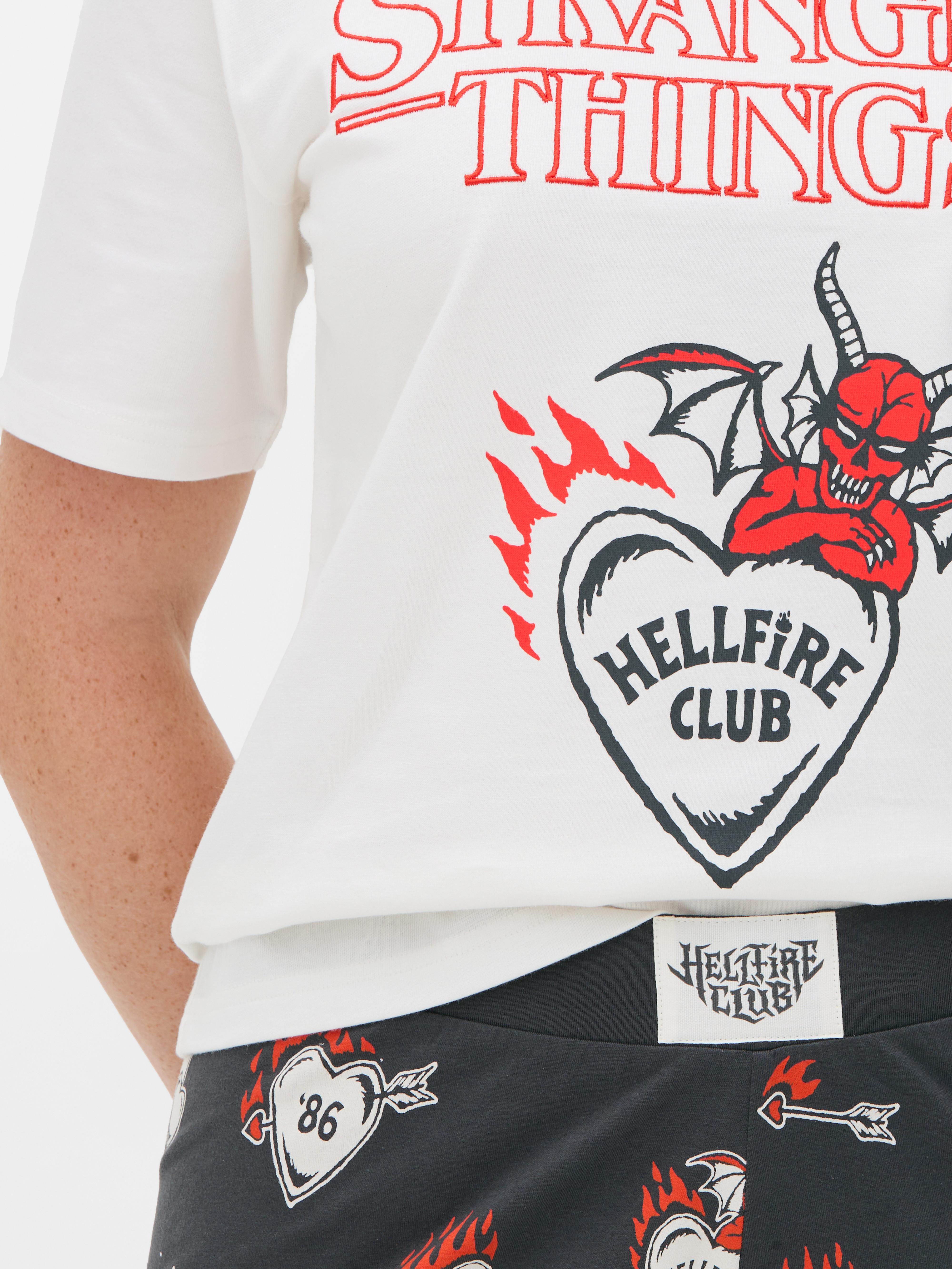 Get ready for cosy nights with this Stranger Things graphic pyjama set. The short sleeved t-shirt comes in grey with a bold logo and Hellfire Club flaming heart graphic on the front, plus a smaller design on the back. The matching pants are black with an all-over Hellfire Club repeat print, designed with a relaxed, loose fit for ultimate comfort. Made from 100% soft cotton, this two piece set is perfect for sleep or lounging, letting you show off your love for the hit series while staying snug all night long.