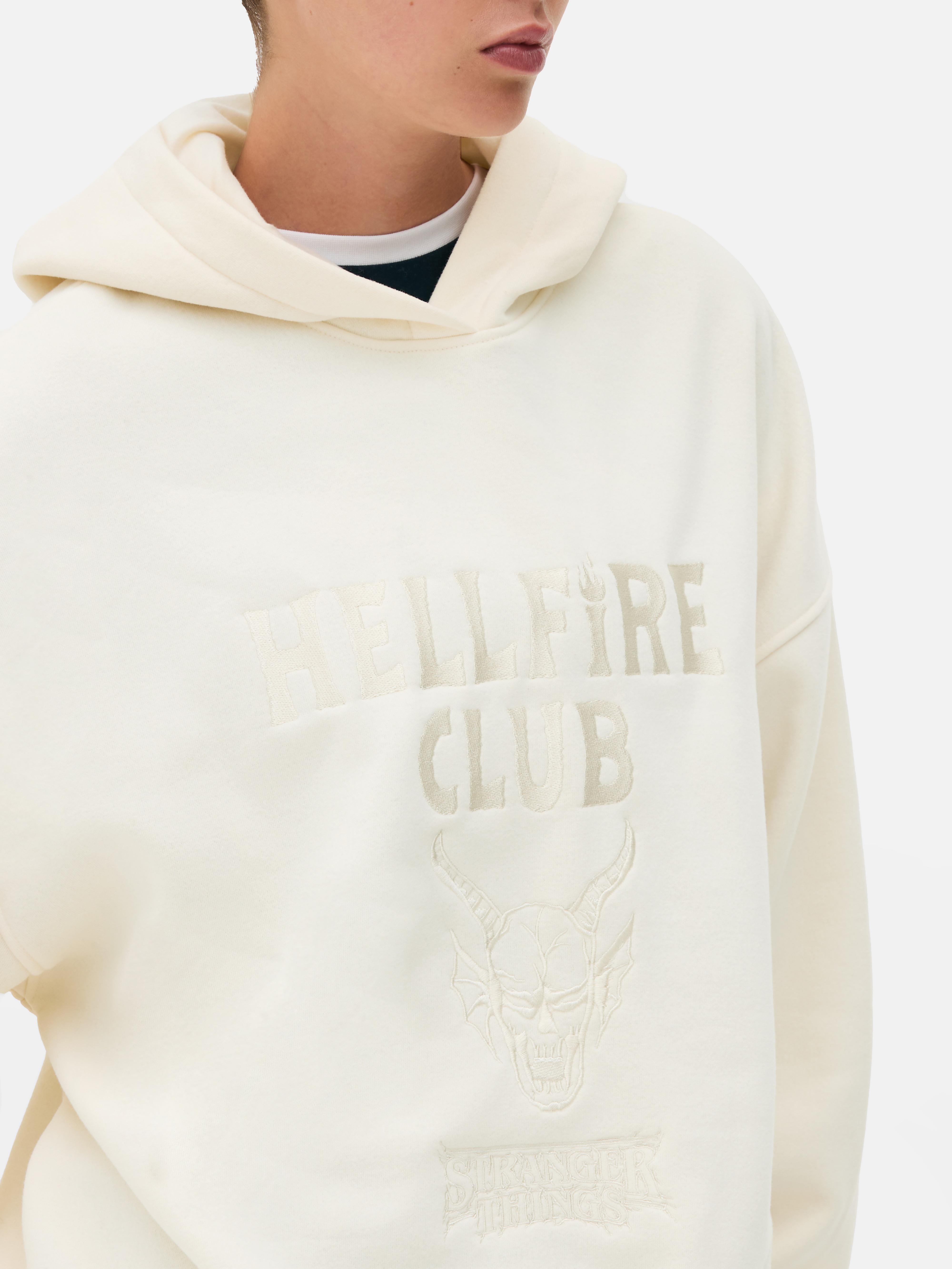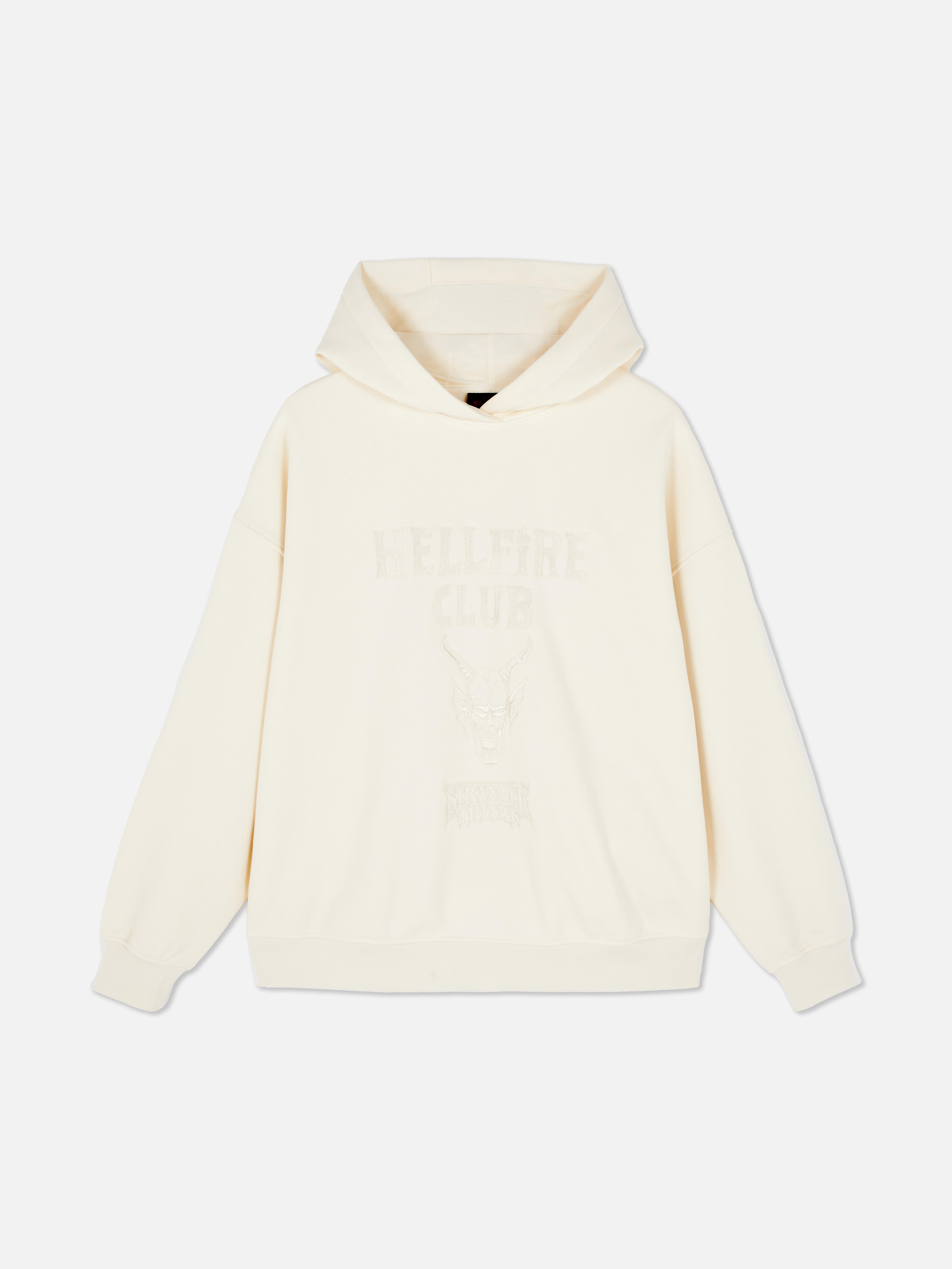 Join forces with the Hellfire Club in this cream-coloured hoodie, inspired by the hit series Stranger Things. Featuring the iconic Hellfire Club logo in a subtle tonal design, this comfy pullover brings retro gaming vibes to your everyday wardrobe. It comes complete with a spacious hood, dropped shoulders and ribbed trims at the cuffs and hem for that perfect relaxed fit. Style it with a tee, high-waisted jeans and chunky trainers for casual weekend vibes, or pair with cargos and boots for an edgier look.
