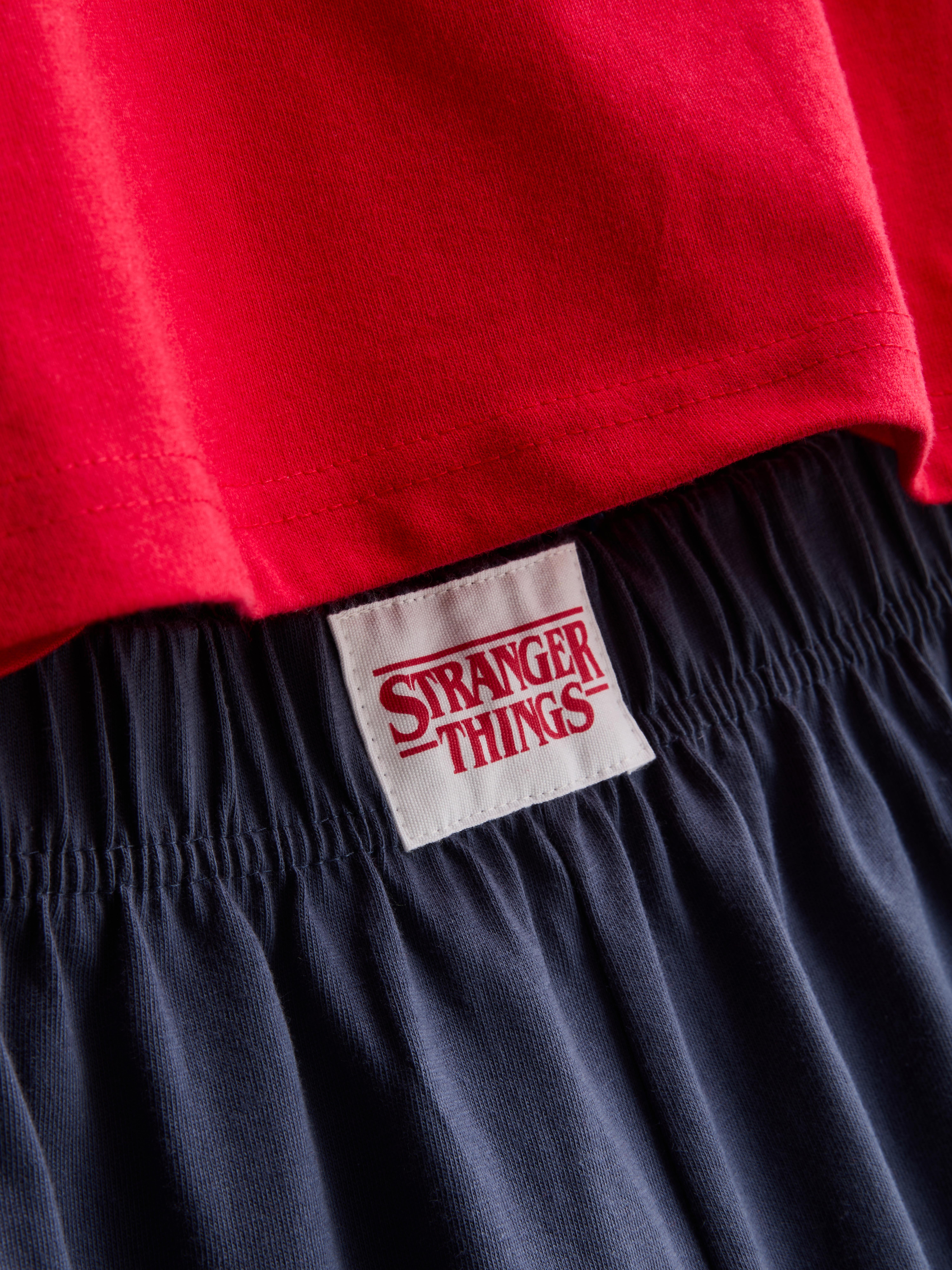 Tune into Hawkins vibes with this Stranger Things WSOK shorty pyjama set. Made from 100% cotton, it’s soft, breathable, and perfect for relaxing or sleeping in comfort. The red short sleeve top includes a bold multicolour “WSQK The Squawk 94.5 FM” logo across the chest, finished with navy ribbed trims at the neck and sleeves. The matching navy shorts feature an elasticated waistband and a smaller logo print on one leg. A playful nod to the show’s retro world, this set brings a fun spin to your nightwear collection.