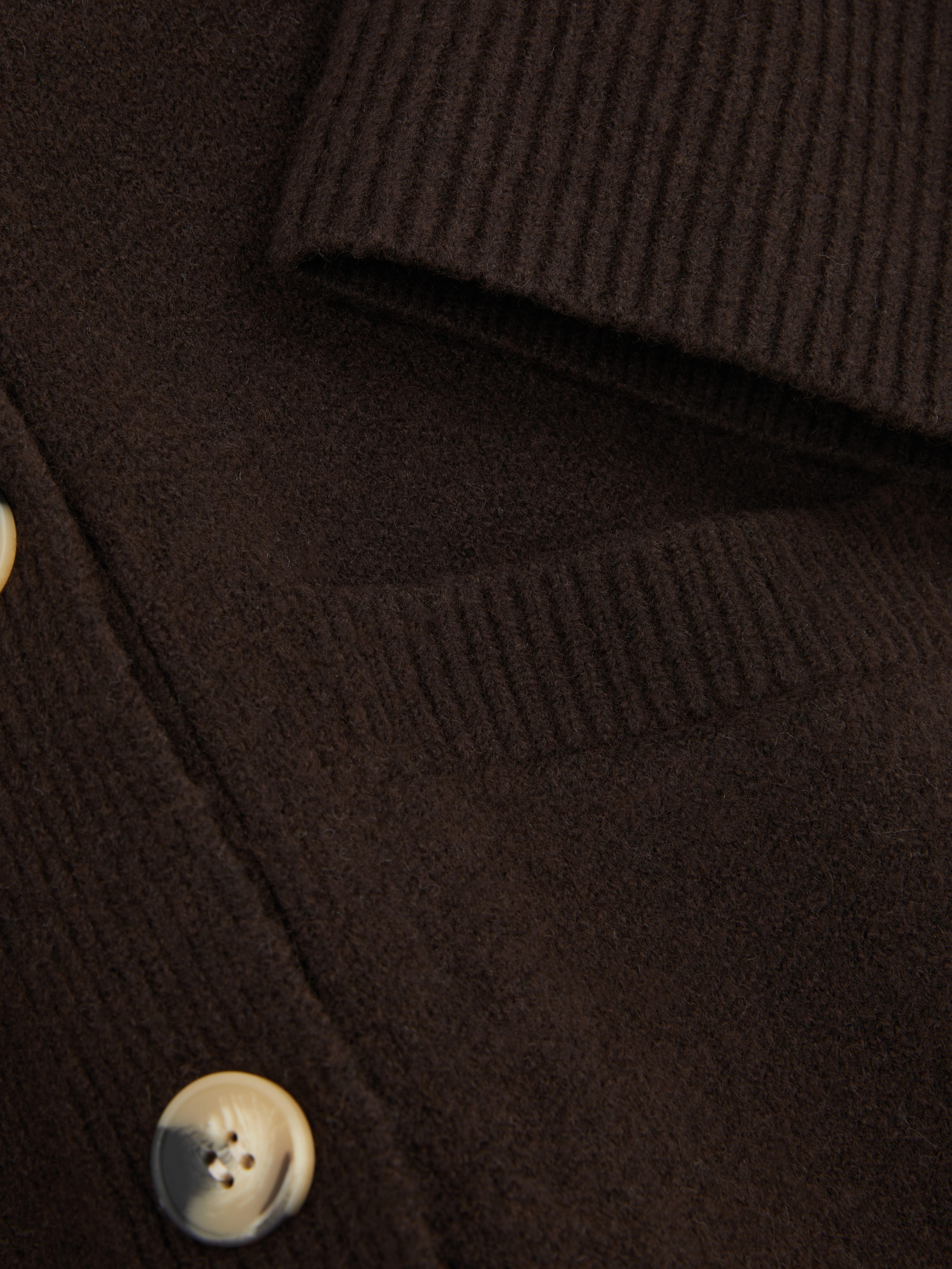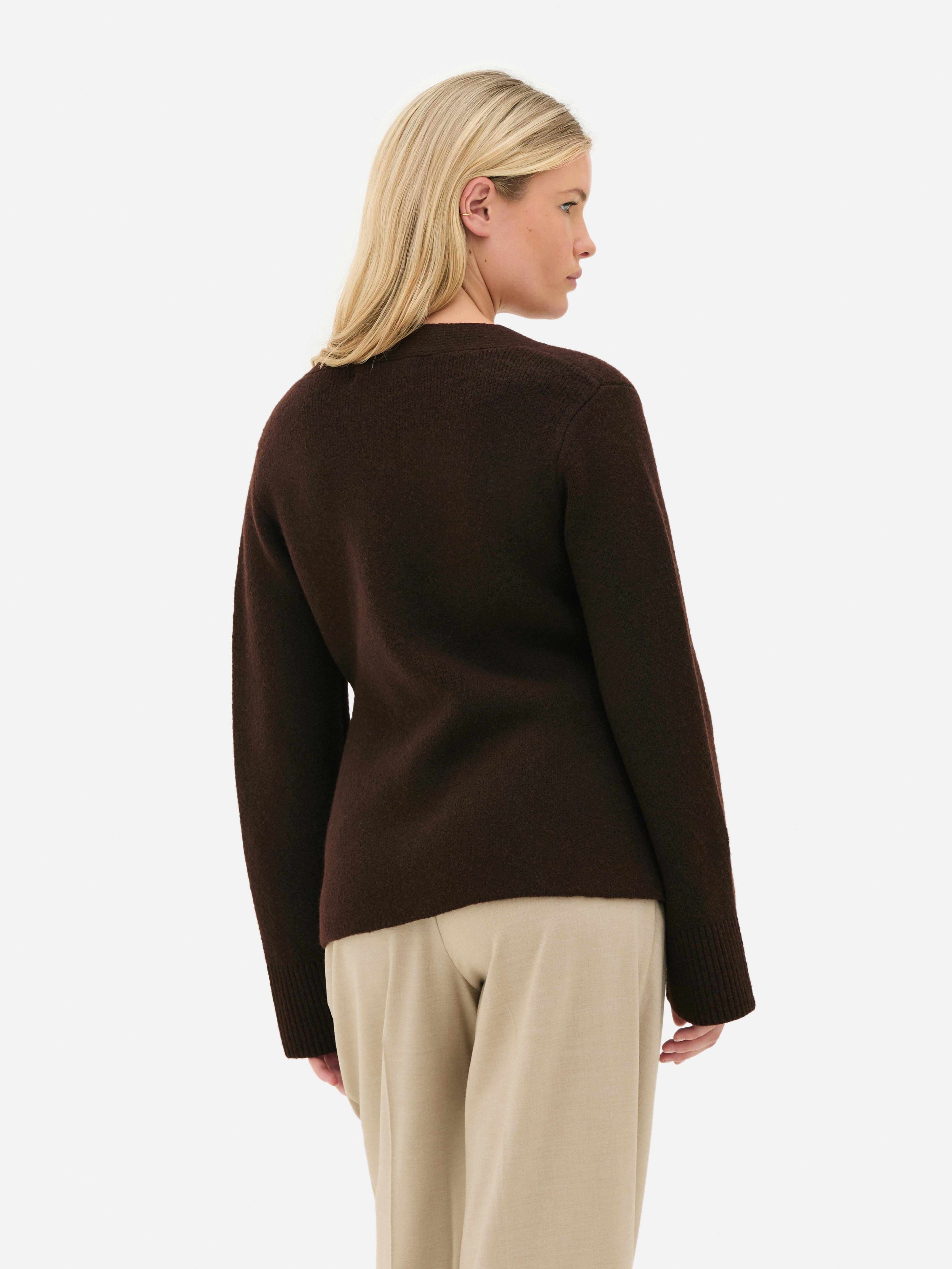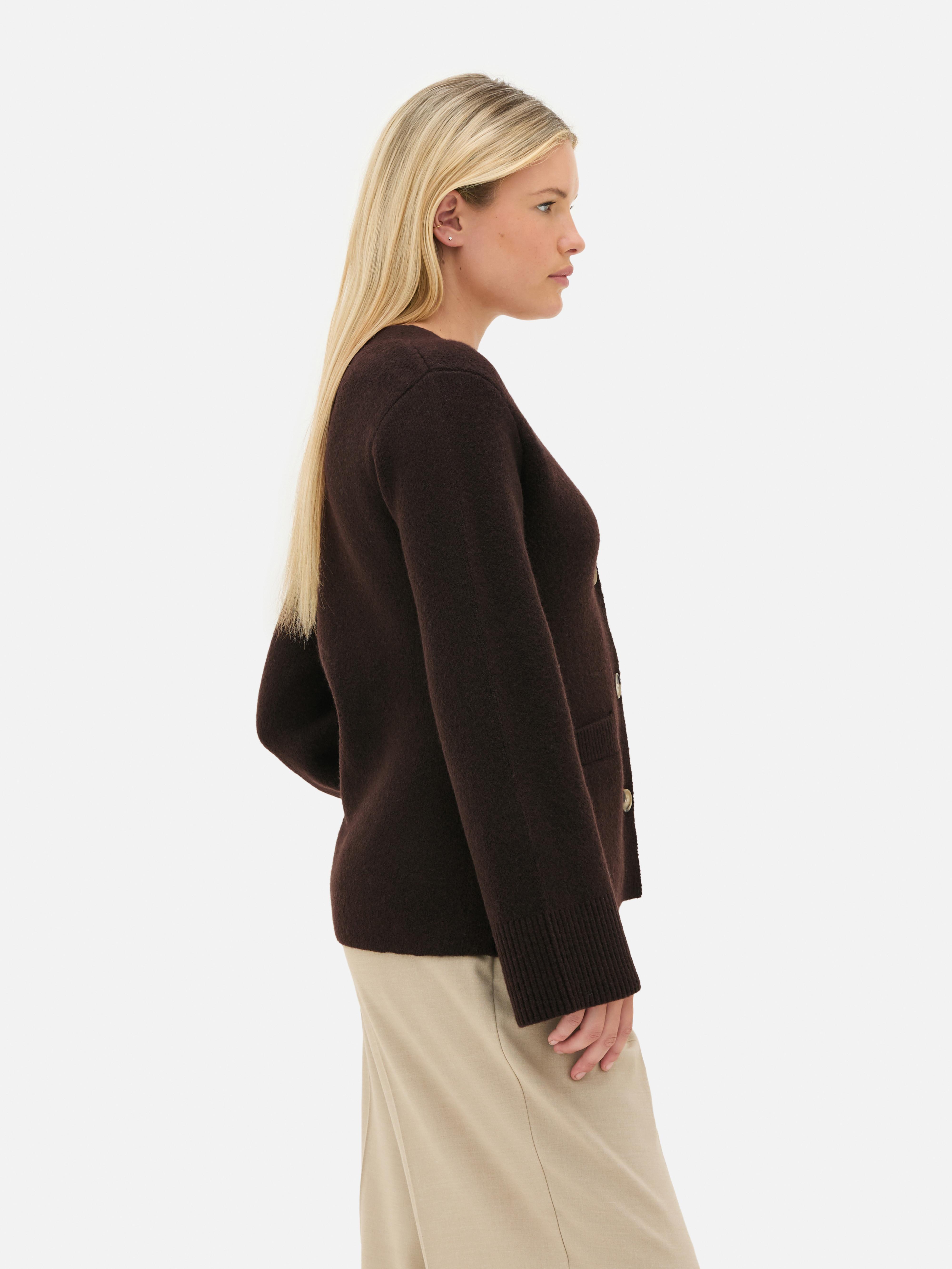 Give your layers a fresh update with this structured cardigan in a versatile chocolate shade. Designed with a V-neckline and button-front closure, it’s finished with ribbed trims at the cuffs for a neat touch. The slightly cropped, relaxed fit and sculpted silhouette add shape while keeping things easy to wear. Two front patch pockets bring both style and practicality, making it an effortless staple for everyday outfits.