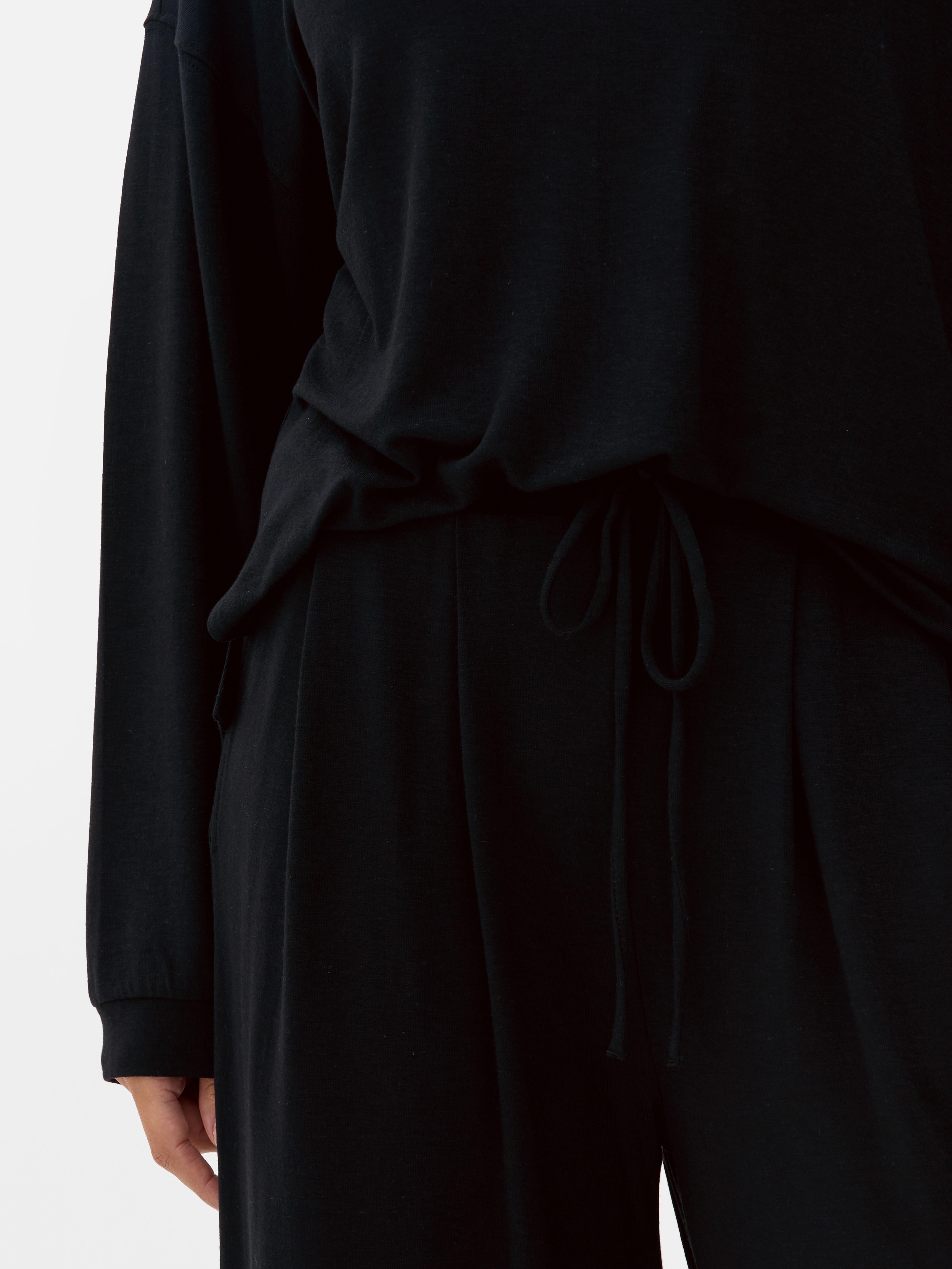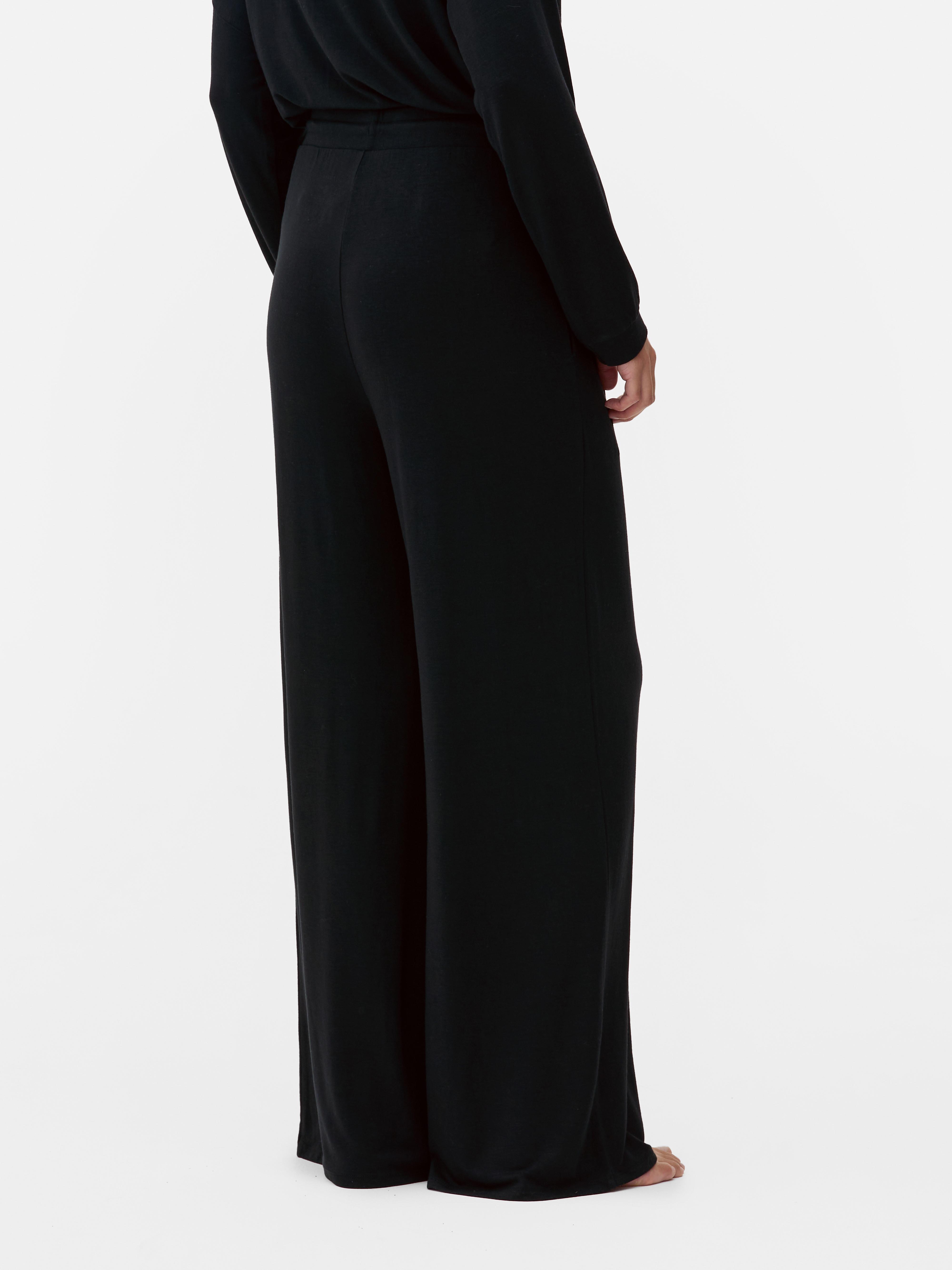 Let comfort lead the way with these black wide leg sleep trousers. Made in a soft, flowing fabric for a light feel, they come in a relaxed, loose fit that keeps comfort top of the list. The elasticated waistband with an adjustable drawstring tie makes it easy to find your perfect fit, while side pockets add a practical touch for carrying your essentials around the house. Full-length to keep you comfy from top to toe, pair it with the matching top for a co-ordinated loungewear fit.