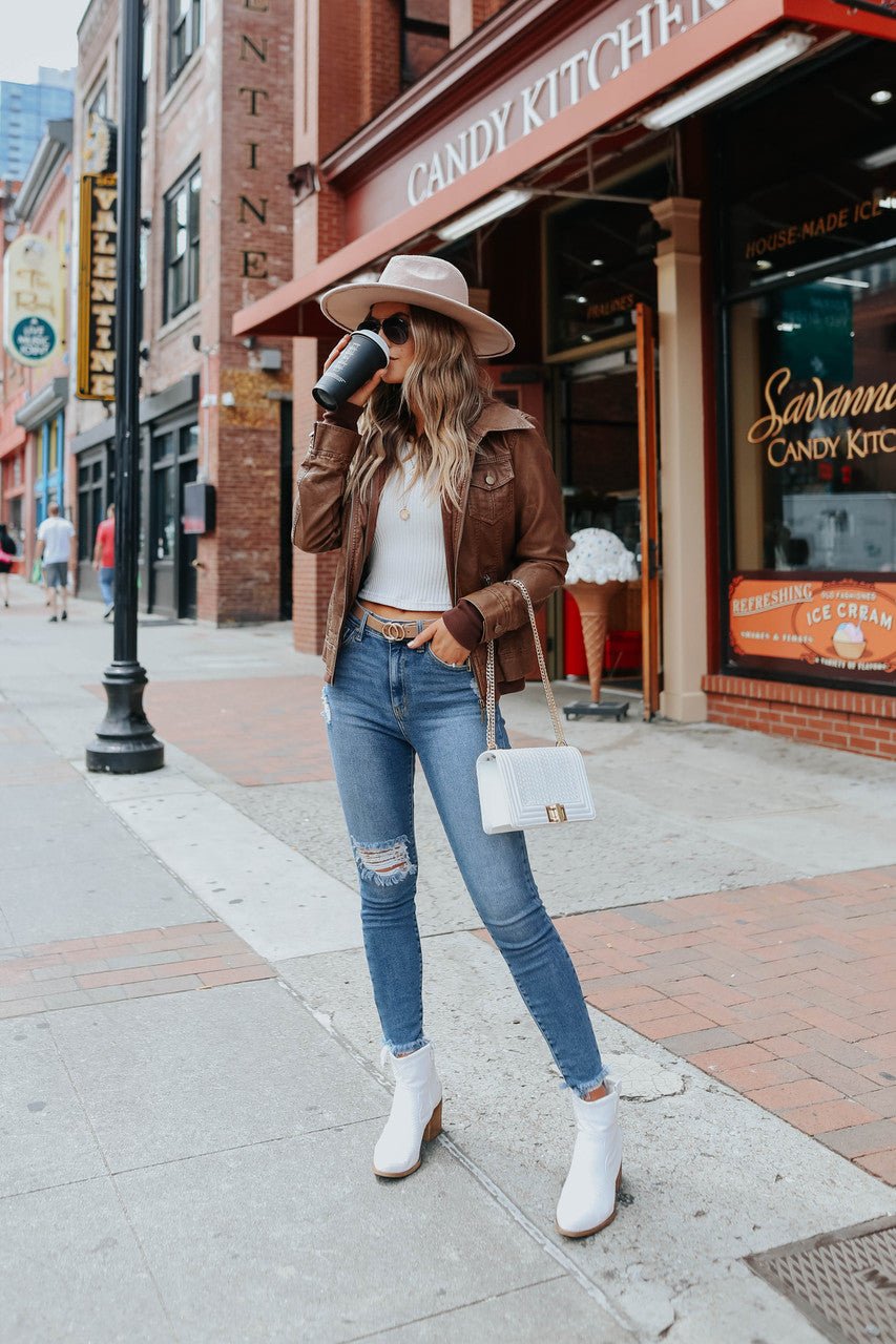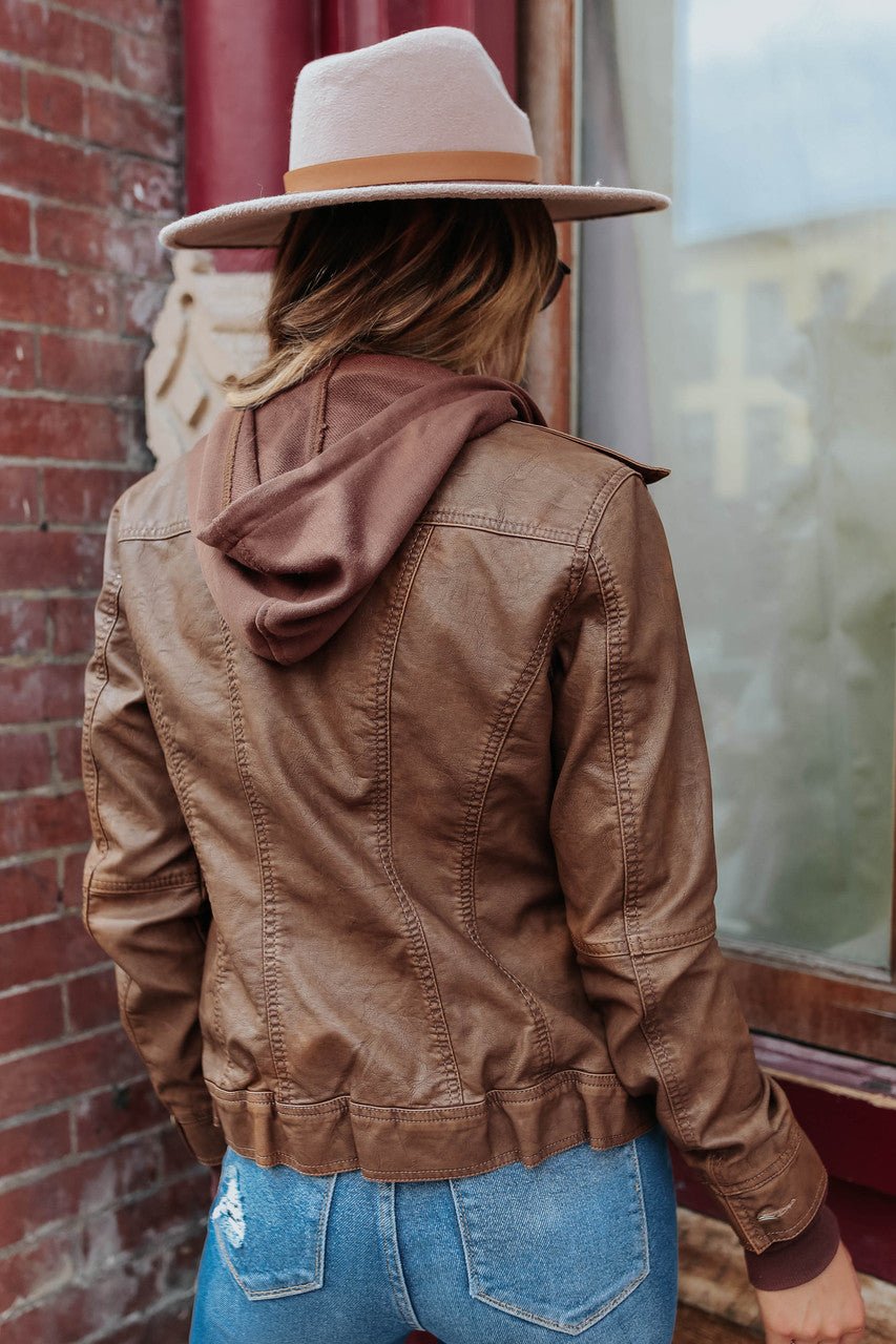 Your closet wouldn't be complete without this jacket! This vegan leather jacket features a sweatshirt hood & lining and has a zip up front. Some other key features we love: the drawstring hood, zipper pockets, and the ribbed contrast hem!�
