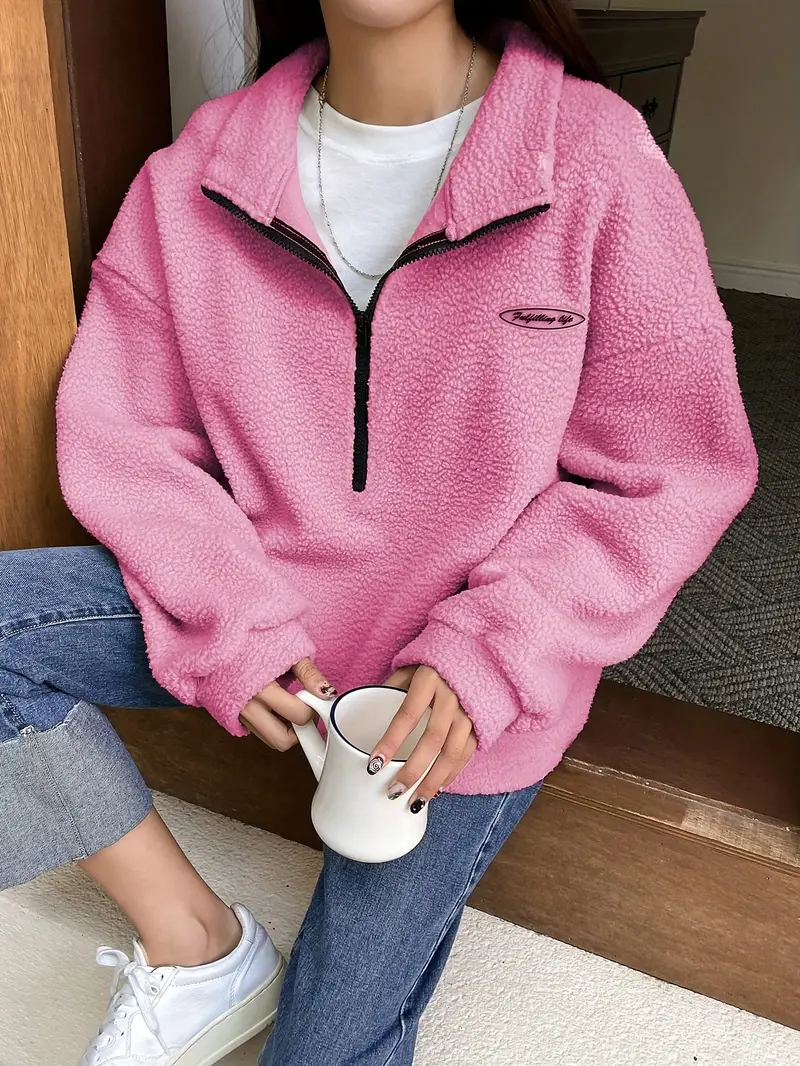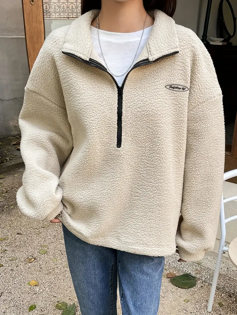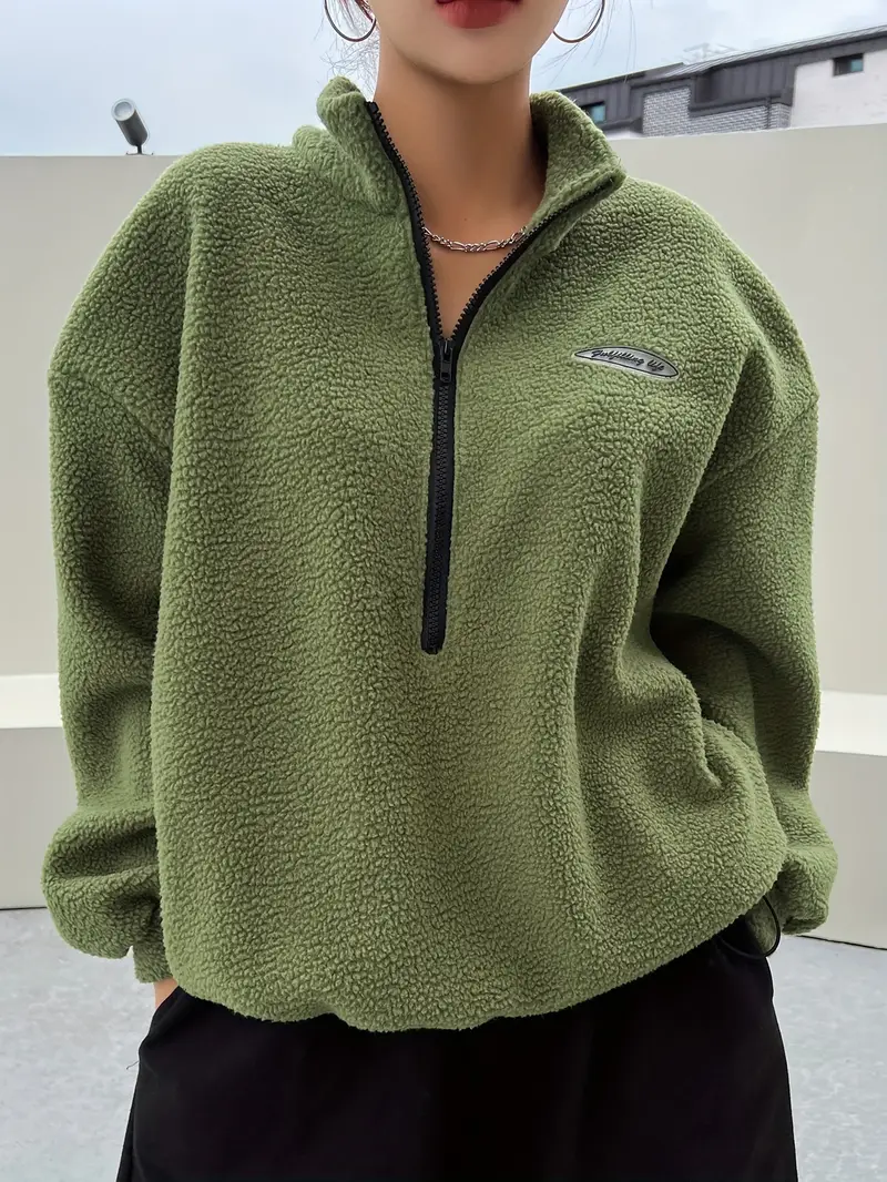 • Women'S Casual High Neck Fleece Sweatshirt with Zipper Detail, Solid Color Polyester Pullover for Fall/Winter - Cozy Knit Fabric Outerwear