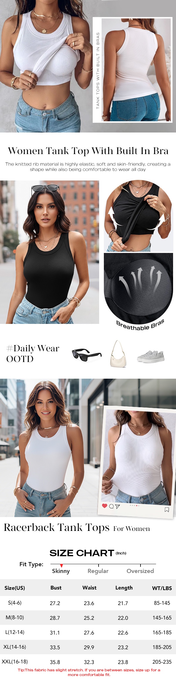 Built-in Bra Support: Tank Tops With Built-in Non-removable Bra Pads, Soft and Breatheable, Providing all-day Comfort and a Flattering shape, Seamless Stitching, Geat Sewn. No need to worry about finding the right bra to wear underneath.