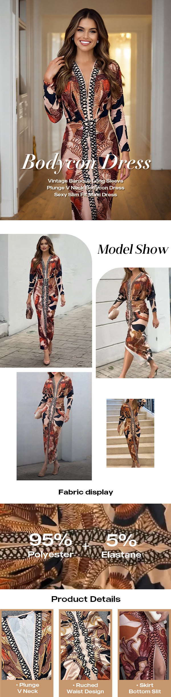 Design Details: Features a plunging deep V-neckline, long sleeves, ruched waist detail, and a daring front slit, complemented by a vintage baroque print.