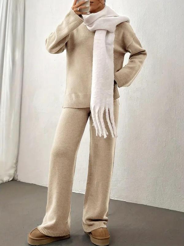 Women's Solid Drop Shoulder Split Hem Sweater & Elastic Waist Straight Leg Pants Two-piece Set, Casual Fashion Cozy Knitwear Set for Daily Outdoor Wear, Women Knitwear for Fall & Winter, Womenswear