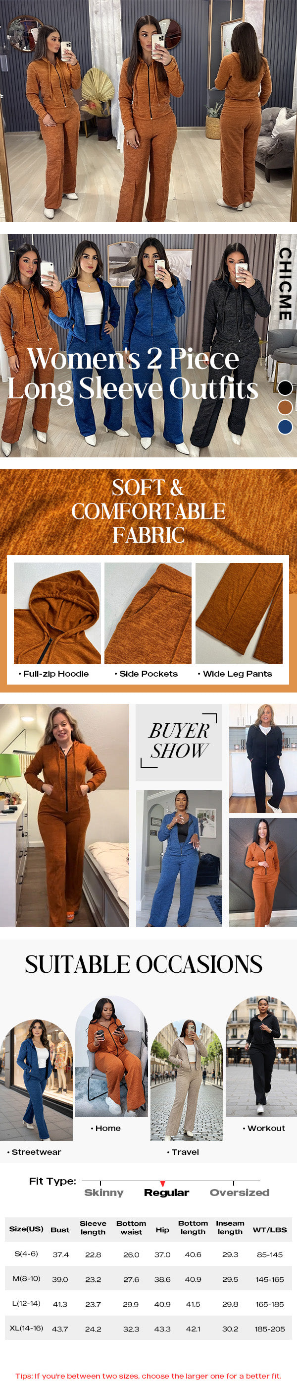 Design Details Features a zip-up hoodie with drawstring hood and practical pockets, paired with elastic waist wide-leg pants that include seam front detailing and side pockets for both function and style.