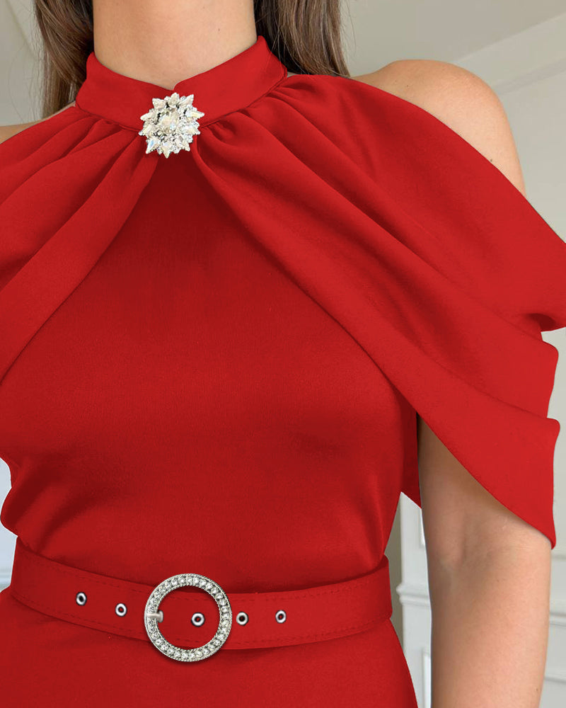 • Chic Plain High Neck Party Dress with Cold Sleeves and Sparkling Rhinestones Decor Elegant Slim Fit Midi Dress (With Belt)