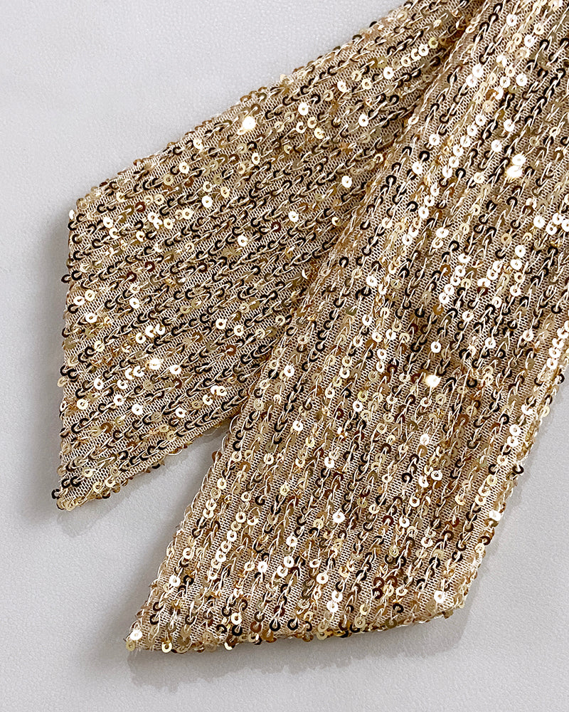 Design Details: A square neckline sets a structured frame, paired with a hollow-out back and a sequin bow-tie detail for visual impact. Gold contrast sequins highlight the side and front, enhancing the dress��s refined yet statement-making design.